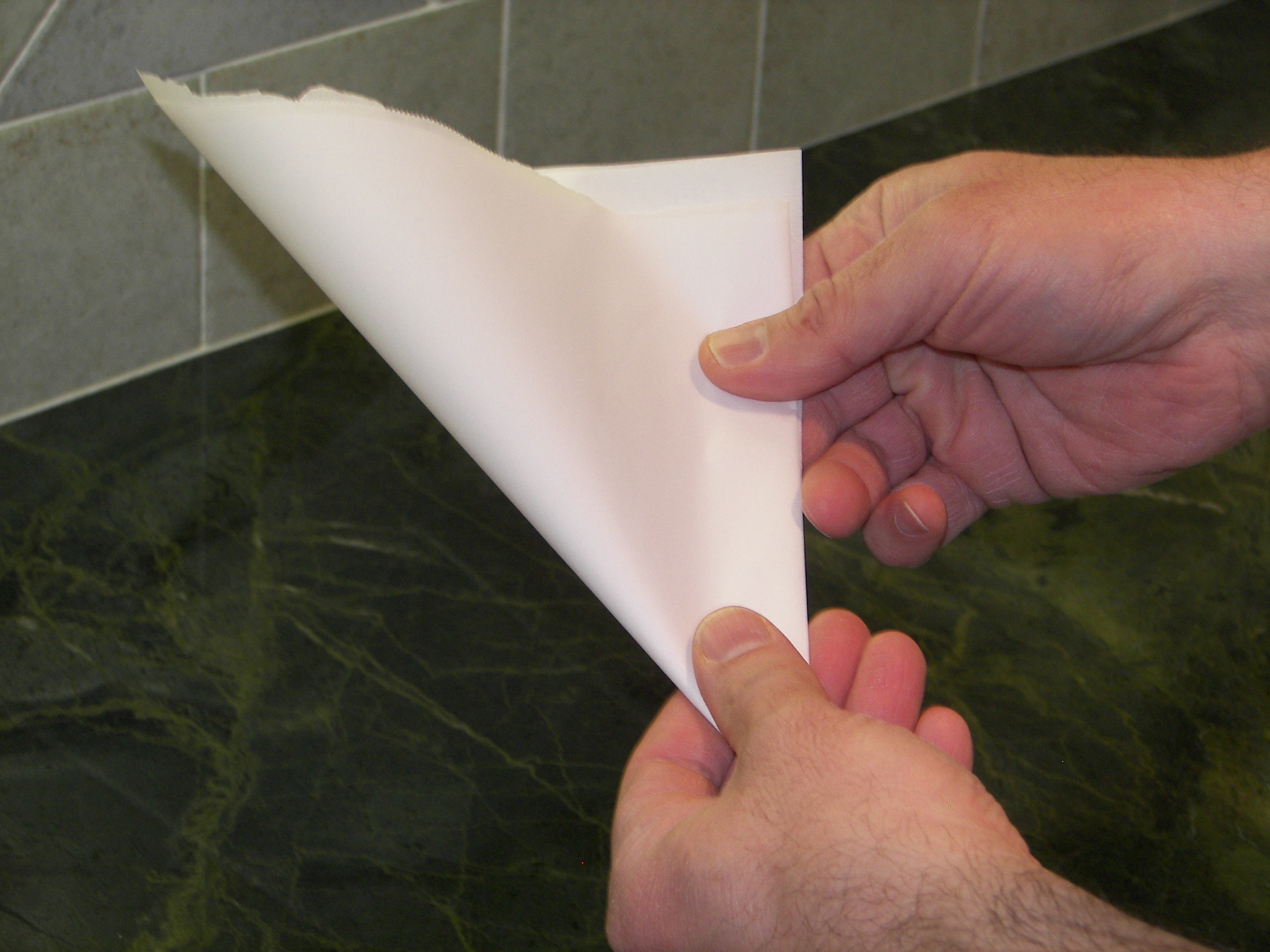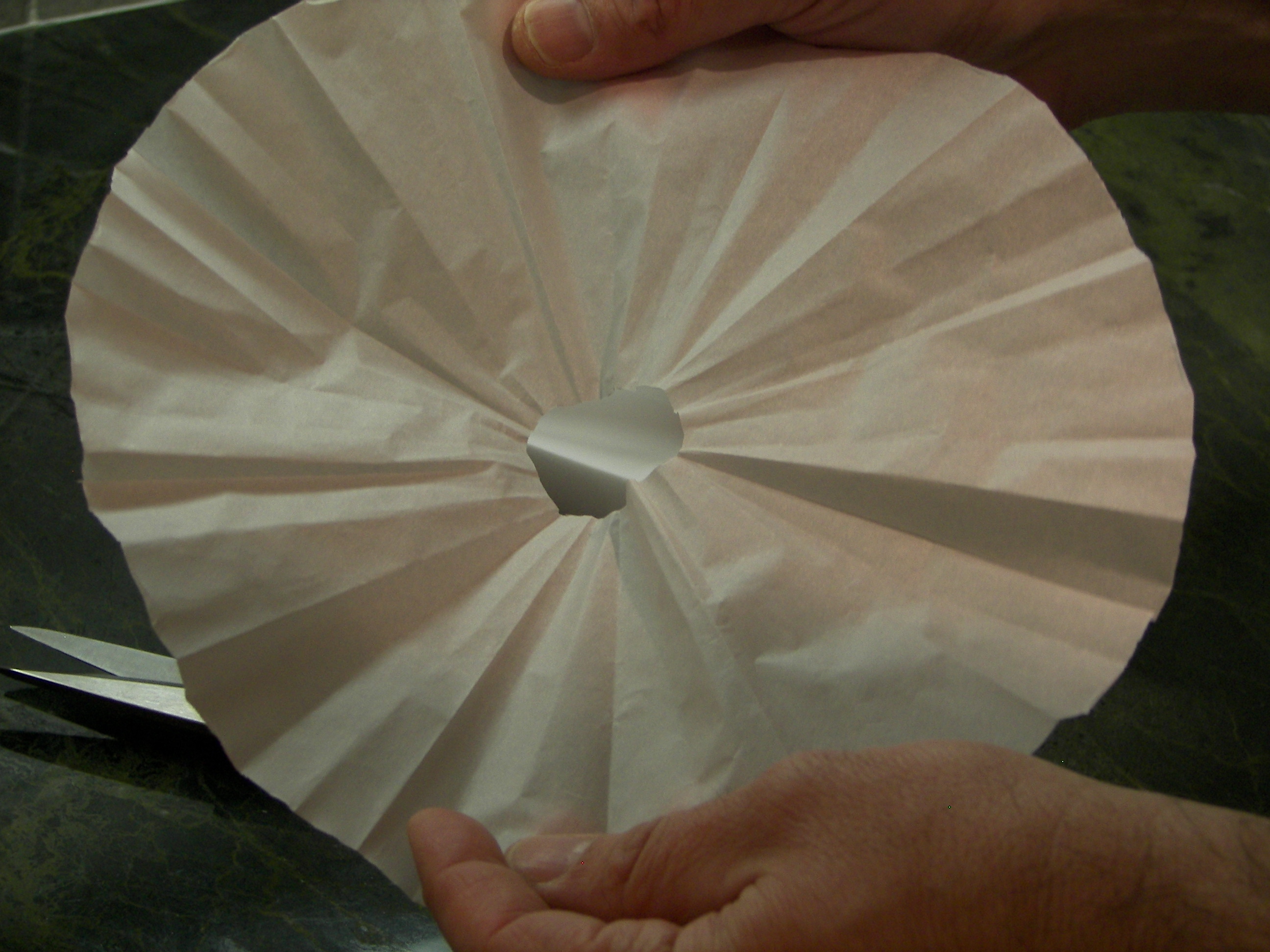 If it is too large, refold paper and cut a bit more off the back edge. If greater evaporation is required, cut the tip off when still folded. This will create an opening in the middle.