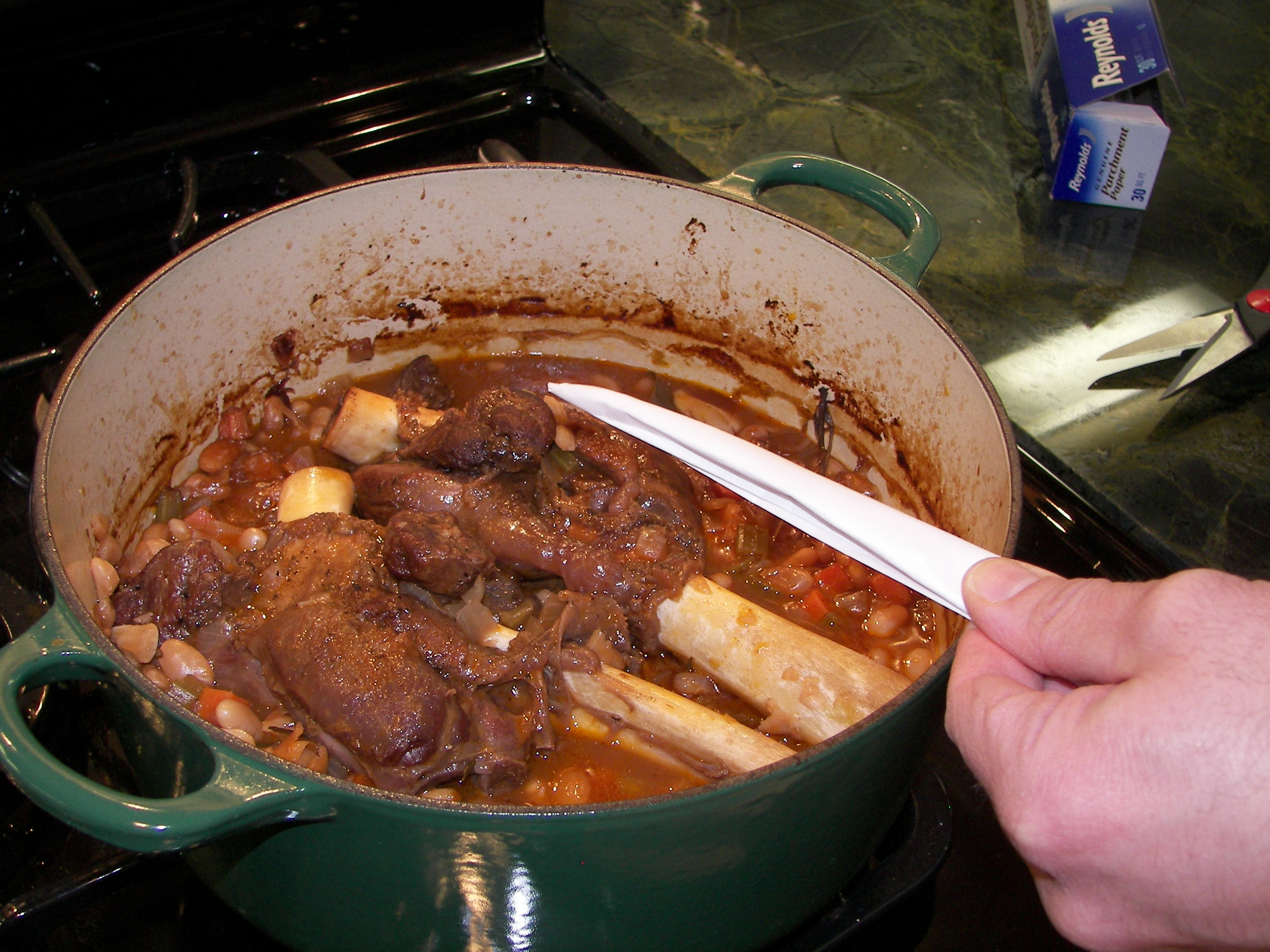 To create a parchment paper lid, first tear a portion of parchment paper from the roll.  The piece should be larger than the diameter of the appropriate pot.