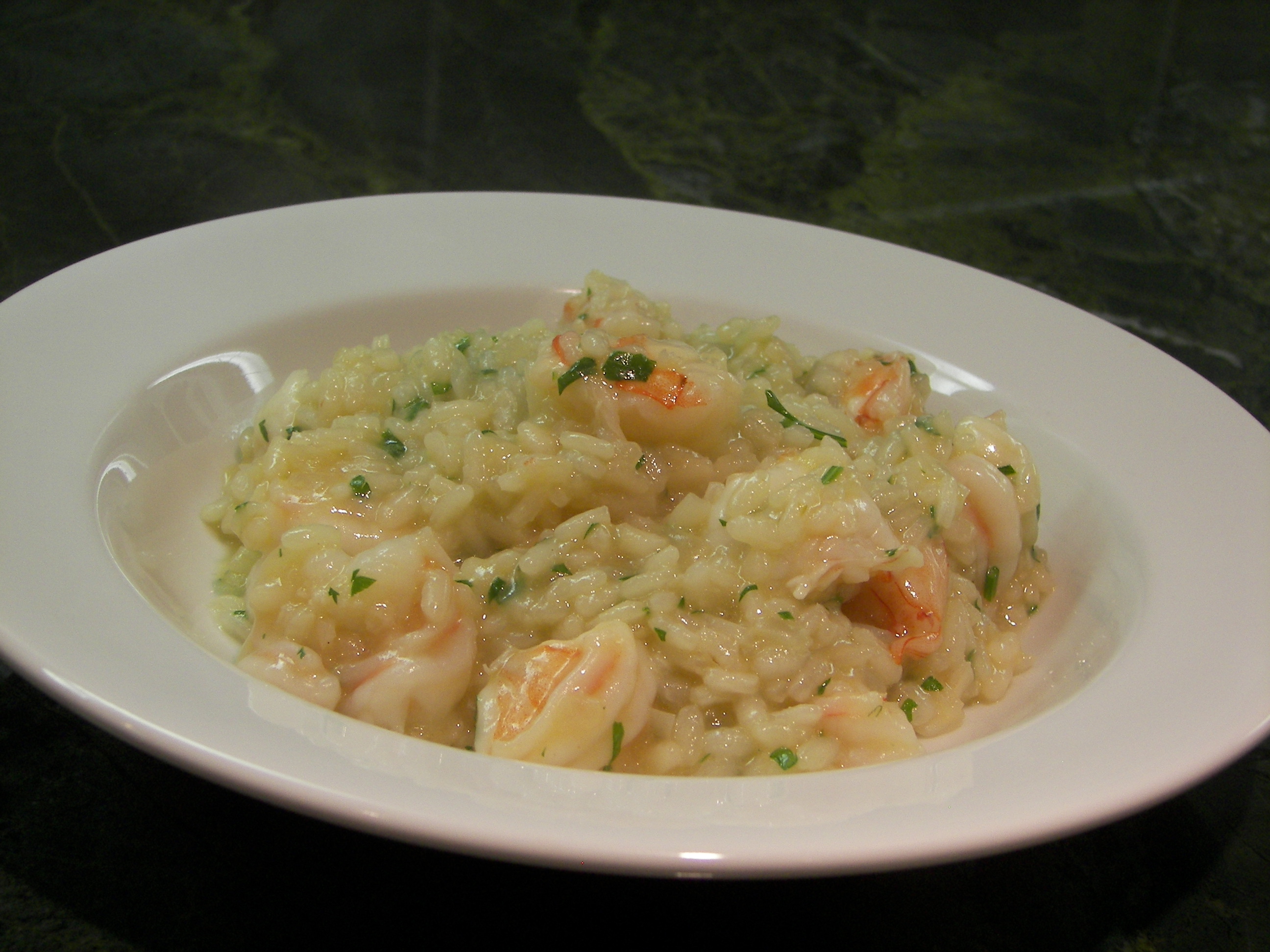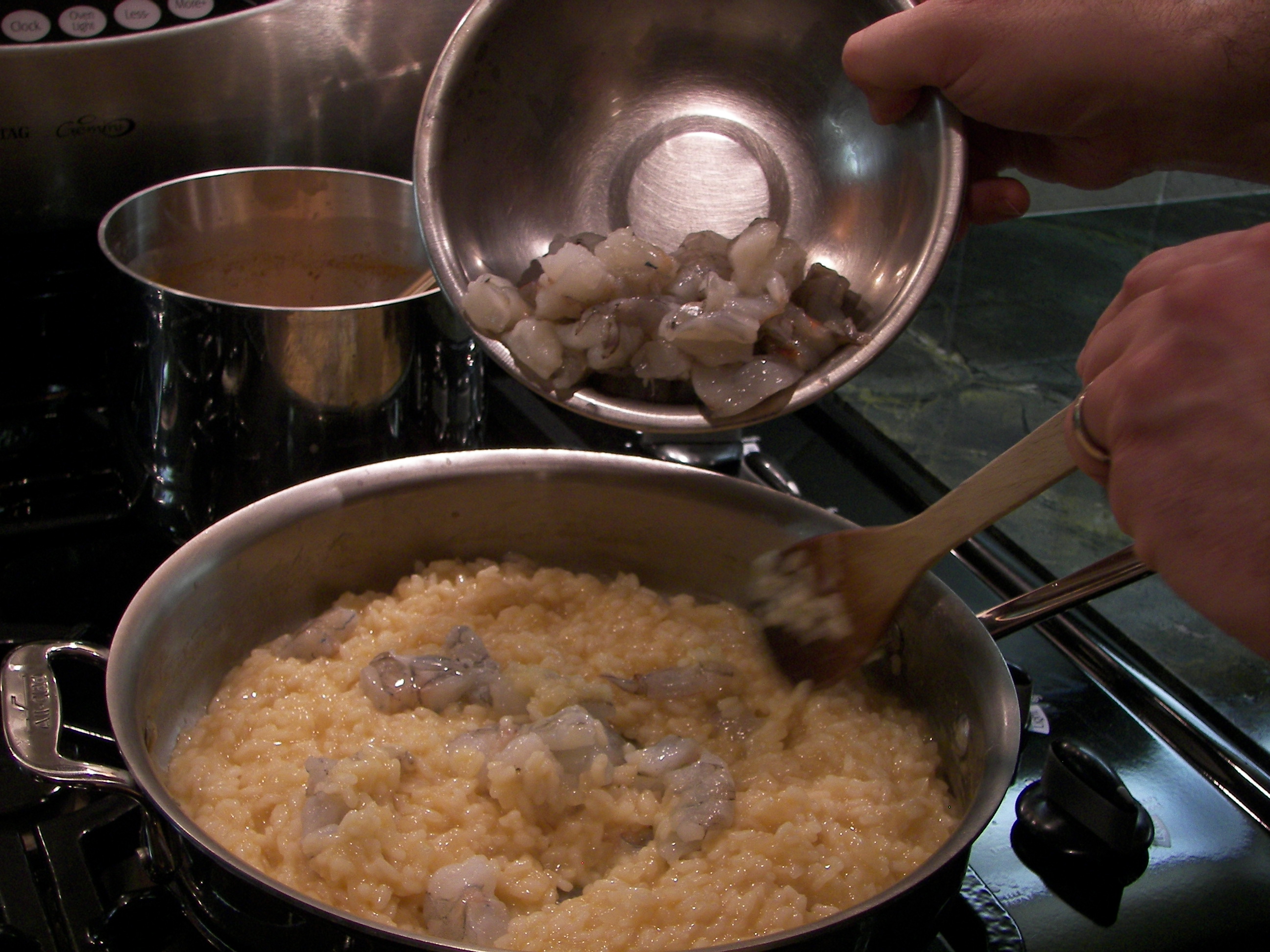 The Shrimp version seems to be a favorite among our dinner guests. The dish usually earns accolades far greater than the amount of effort exerted in preparation. We typically serve it as a starch course to accompany white-fleshed fish such as Swordfish or Halibut.  Other times, Janine and I prepare it as a main course when we are dining alone and desire something from the sea. A bowl of Shrimp Risotto, a crisp green salad, and a glass of dry white wine makes for a quick meal without much fuss.