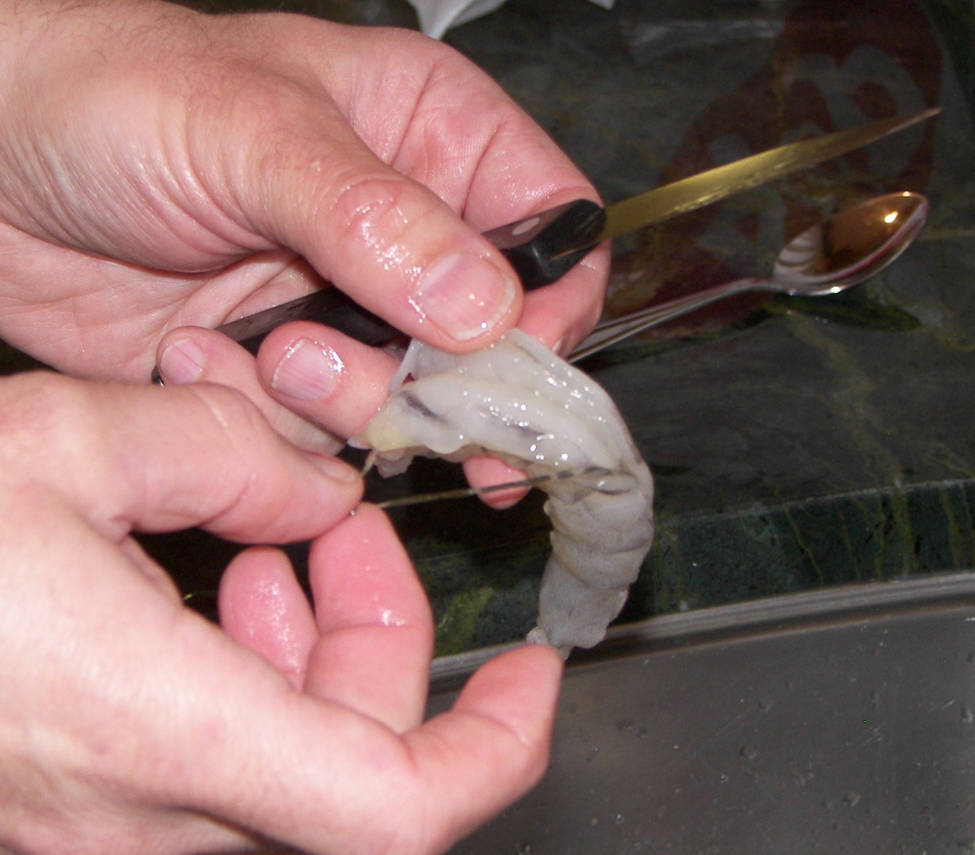 Note: Holding the Shrimp under a light stream of water from the kitchen faucet makes this task easier.