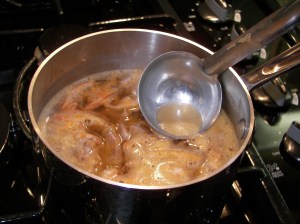 • Place the saucepan containing stock and Shrimp Shells over a low flame on the stove. Bring to a slow simmer.