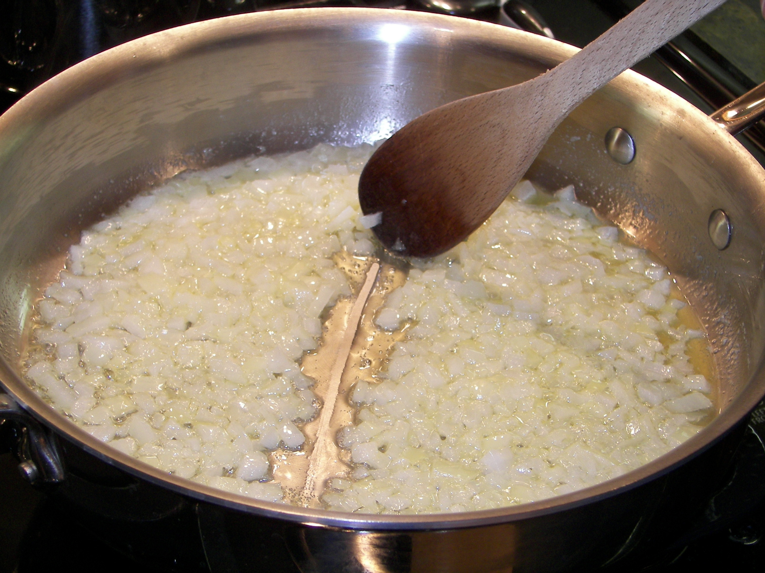 • Heat butter and oil in a sauté pan over medium low heat.  When the butter has melted and stopped sizzling (This means the water content in the butter has evaporated), add the diced onions.