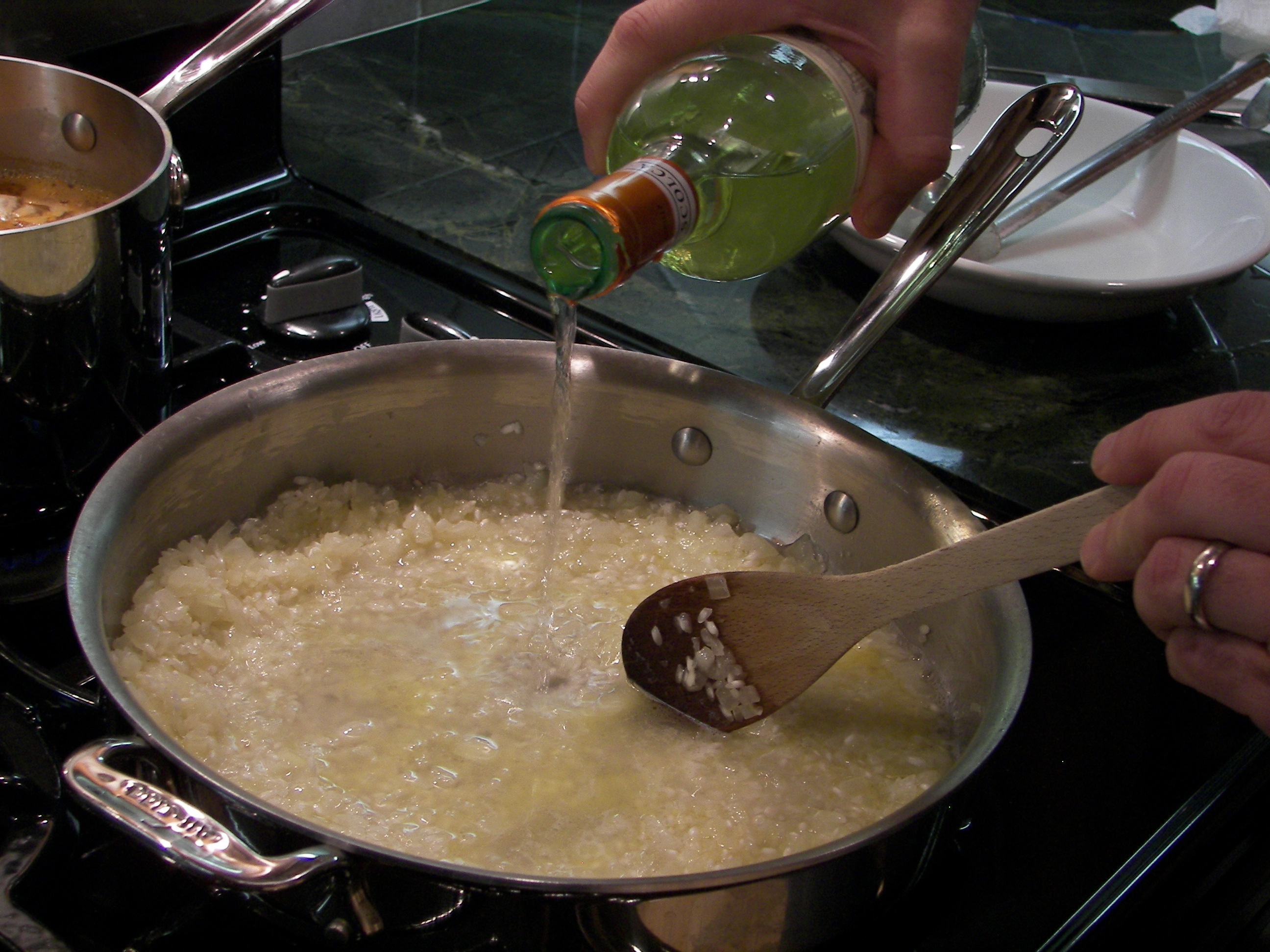 • Add wine to pan. Adjust heat to maintain a moderate simmer. Stir constantly. Continue stirring until wine evaporates and rice/onion mixture becomes thick.