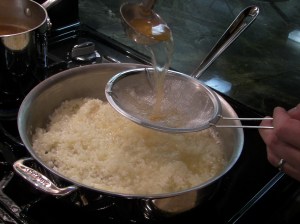 Note: Ladle stock from saucepan and pour through strainer into rice mixture. The strainer will prevent any shell fragments or impurities from being added to the rice.