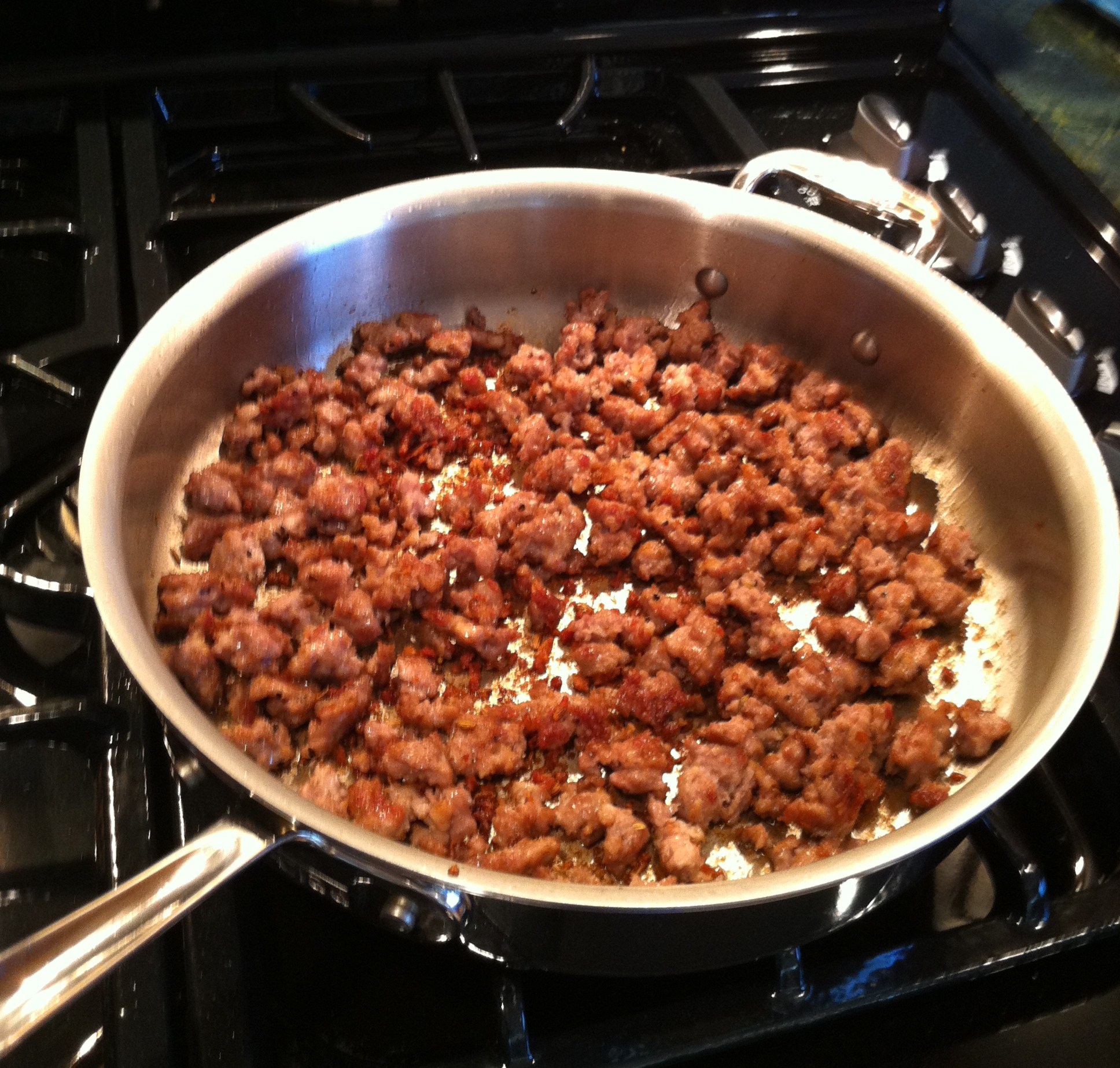 • Take sausage out of casing and fry in pan. You want sausage cooked fully and a little carmelized with dark brown bits but be careful not to over cook. Good Italian sausage is very lean. It can become dry because of the low fat content.  Place in bowl and to the side to cool a bit.