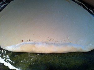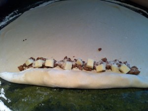 • Layers at beginning and end of dough should be a little smaller. Leave yourself and 1-1/2 inches to 2-inches on each side so it is easier to fold over. This prevents ingredients form seeping out of dough when it cooks.