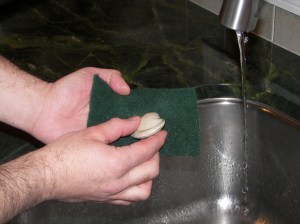 • The shells of the clams must be cleaned thoroughly since they will be folded into the final dish after they are steamed open.  I favor using a 3M green scouring pad. Simply scrub each clam under running water until all traces of sand and debris are removed. Rinse clams thoroughly and set aside.