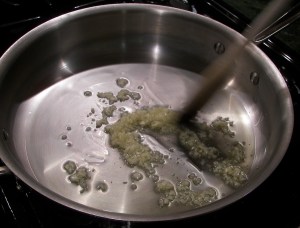 • Pour olive oil into a sauté pan with a tight fitting lid. Make sure the pan is large enough to hold an entire pound of cooked pasta. Add minced garlic.