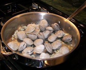 • Place a large pot of water over a medium flame. Cover and bring water to a slow simmer (The water will be brought to a boil and the pasta added once the clams are steamed open).