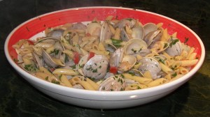Our version of Penne and White Clam sauce is a good example. The bi-valve’s briny qualities are the focal point of the dish. Their flavors are coaxed by gently steaming in olive oil, garlic and white wine.  The pasta is partially cooked in boiling salted water and then finished in the residual steaming liquid. This infuses it with clam flavor. Chopped tomato and parsley are added for a little color. A richness is achieved by folding in a few pats of butter right before serving.