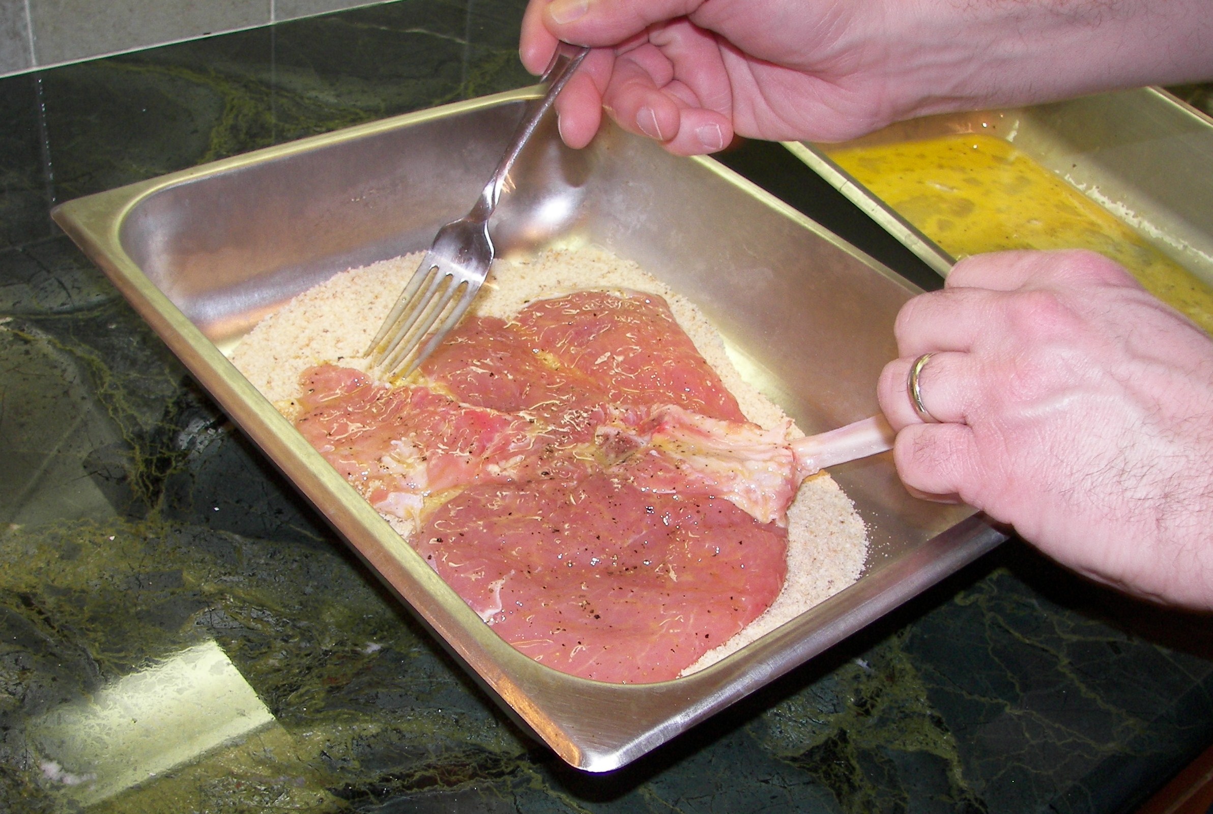 - The chops will be dipped in egg wash and bread crumbs before being fried golden brown. To create an efficient work space, arrange two separate pans in close proximity to the frying pan on the stove. Each one should be large enough to fit an entire chop. Crack and beat the eggs into the pan furthest from the stove. Place the bread crumbs into the middle pan.