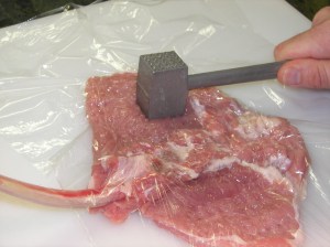 - Flip the chop so the end of the rib bone is now pointing up. Spread each flap of the veal so the chop is laying flat on the cutting board. The rib bone should be centered between the two medallions. Place a piece of plastic wrap over the chop and pound each side thin with a meat tenderizer (The bottom of a small pan will work equally as well). If each side of the chop was sliced to 1/2” thickness before tenderizing, they should be ¼” thick when you are done.