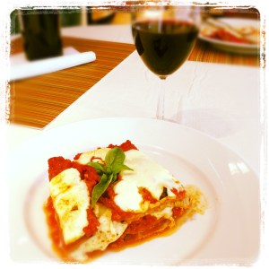 Pour 1 cup of tomato sauce in the bottom of the lasagna pan. Tilt the pan back and forth to evenly distribute sauce across the bottom. Sprinkle a generous portion of parmesan cheese on top of the sauce. Layer the eggplant on top of the sauce.