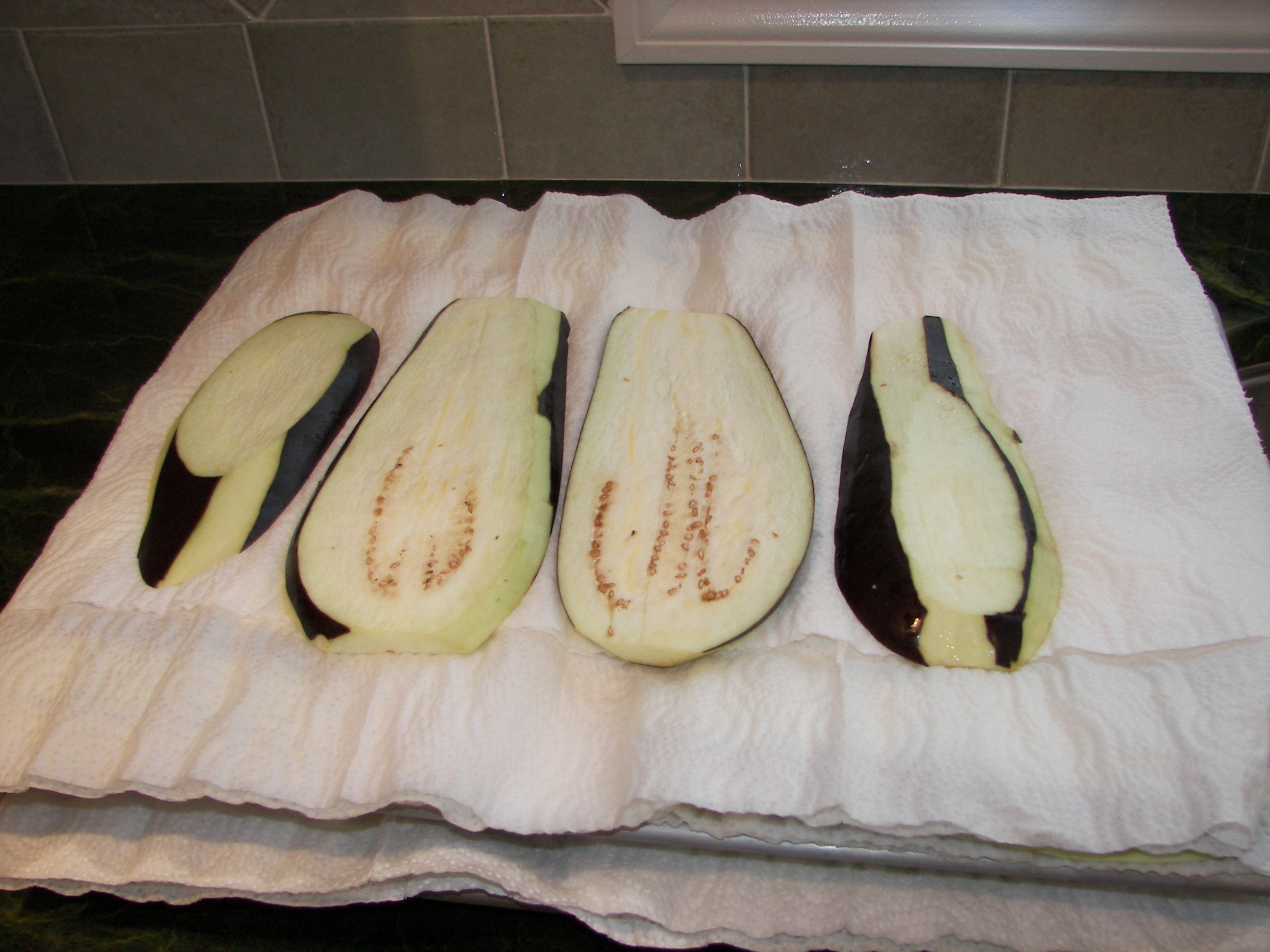 We’ve found that if you don’t remove some of the moisture from the eggplant before you fry it. The moisture gets trapped inside the flour-egg-bread crumb coating and makes the dish very soggy. Now that winter has rolled into New Jersey, the only eggplants available are spongey and kind of stringy. We can’t wait until early summer when all of the fresh locally grown ones come to market!
