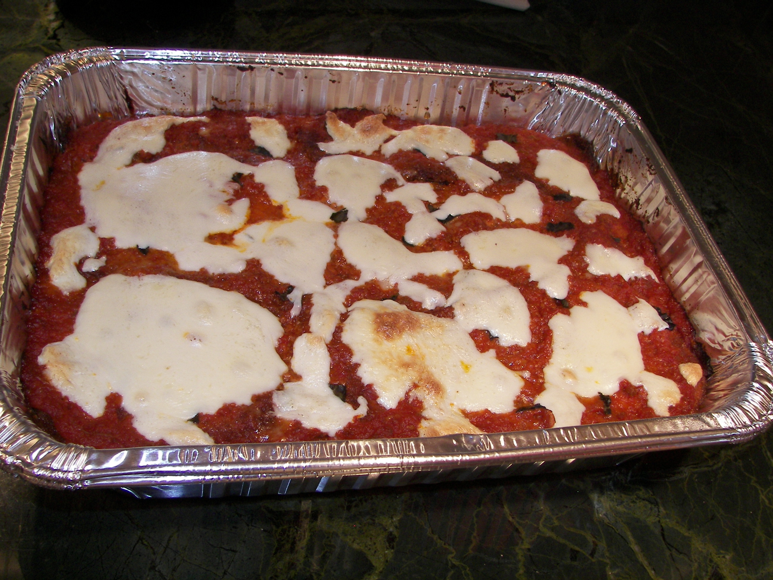 Making Eggplant Parmigiana has turned into an annual event in our household. It’s literally a big production. Once a year, when the eggplants are in season, we devote an entire weekend to it. The sauce is usually made on Saturday and allowed to sit overnight. Work on the eggplant begins early Sunday morning. First they are trimmed, peeled, and sliced. Then salted and allowed to rest until they release a substantial amount of liquid. The real work begins after they are rinsed and dried. A production line is formed on the kitchen counter where the slices are coated with flour, egg wash and bread crumb. Pans of hot oil wait at the end of the line. A quick dip turns the slices golden brown.