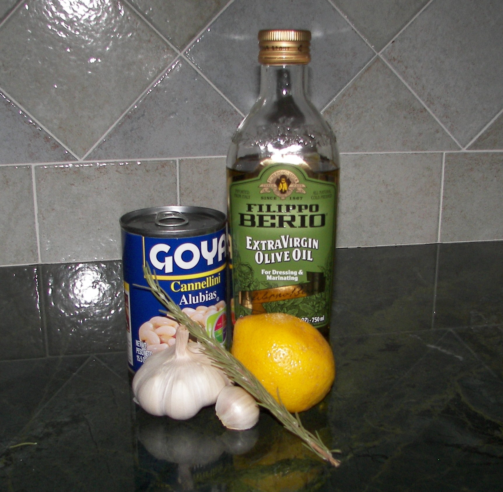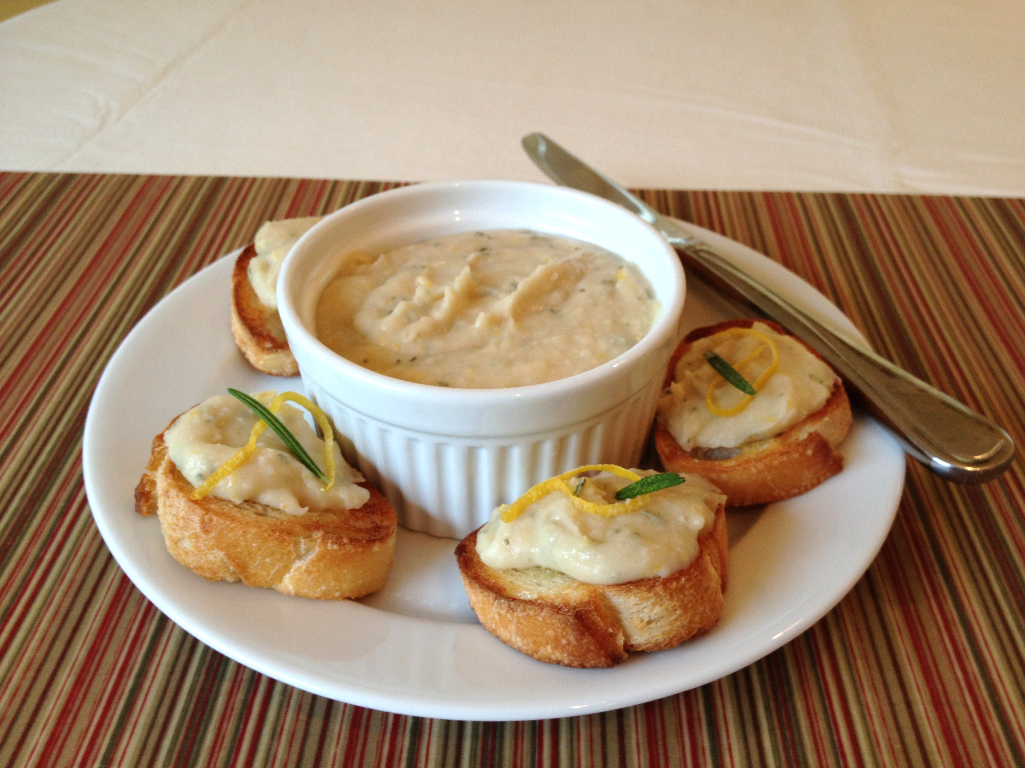 Fold in garlic paste, lemon zest, rosemary, and lemon juice into the bean puree. Add enough Olive Oil until puree is smooth and the acidity of the lemon juice and zest is balanced.