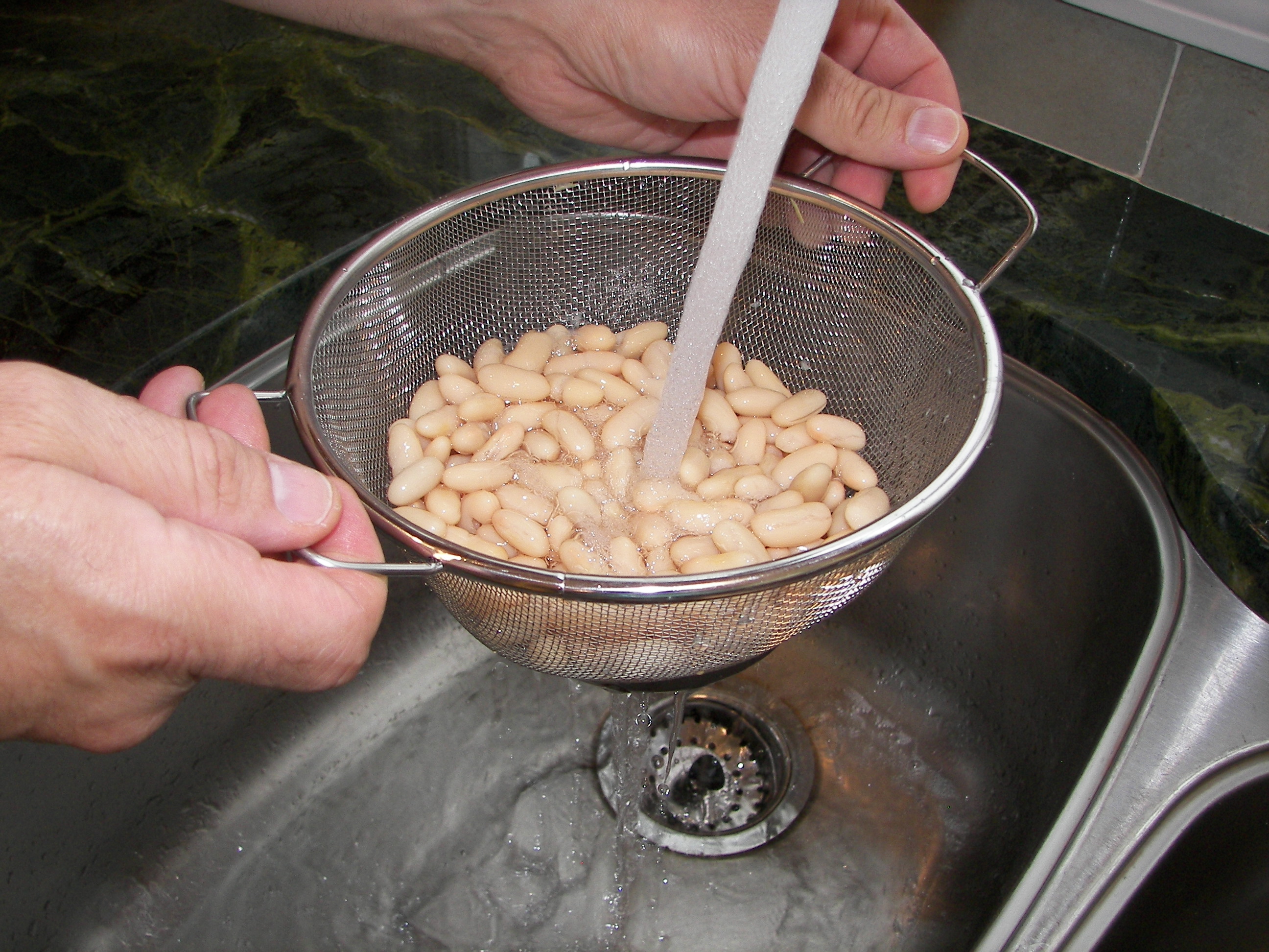 Drain the can of beans into a colander and rinse thoroughly in cold water. Shake colander to drain off excess water. Let stand in sink a few minutes to allow excess water to drip away.