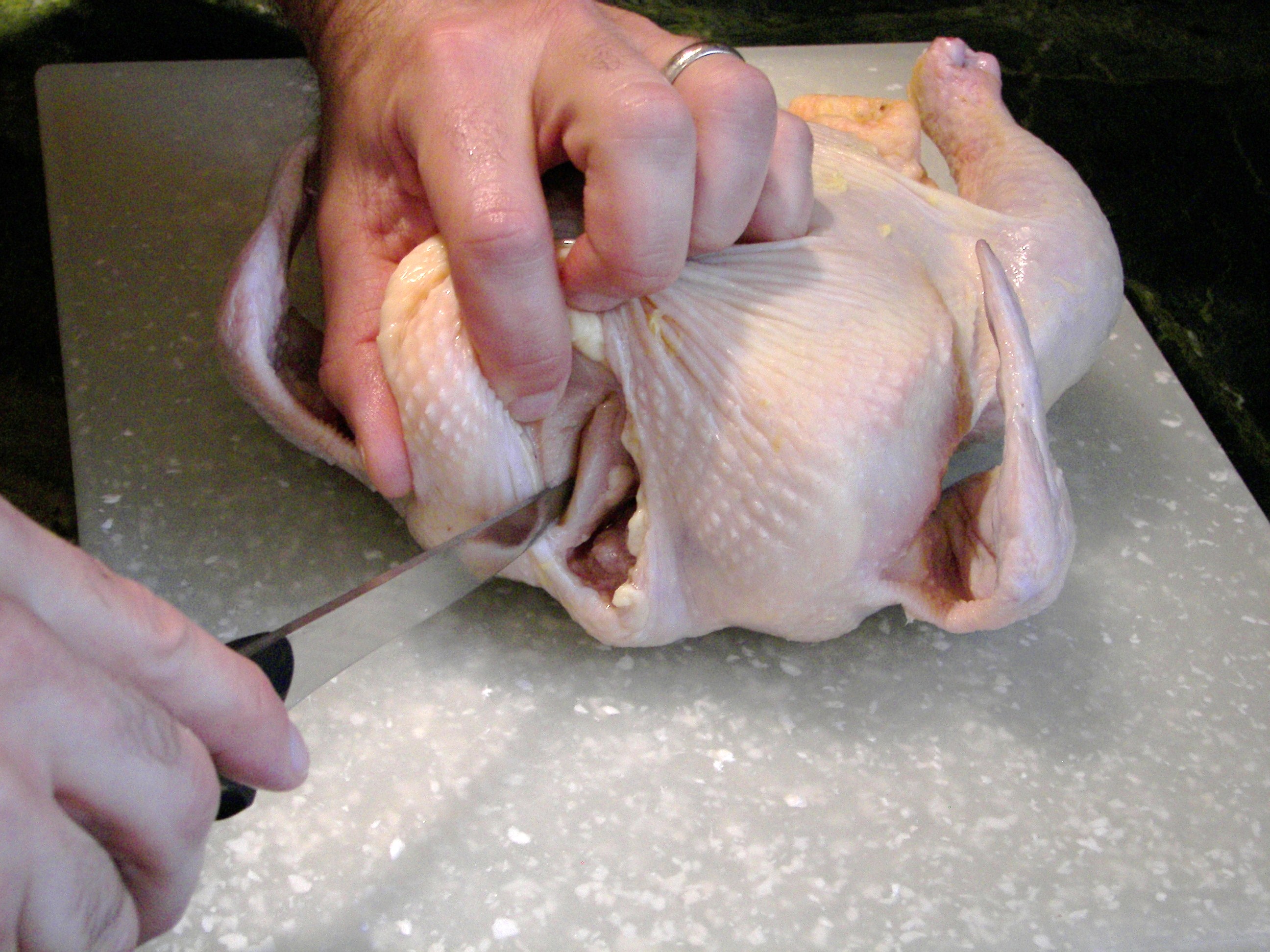 Lay the Chicken on a flat cutting surface with the breast facing down and the open cavity facing up. Make a shallow cut down the middle of the neck cavity until the blade touches the sternum bone. The blade should just nick the top of the Sternum bone. Do not cut too deep.