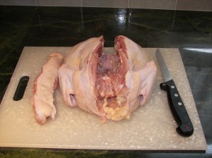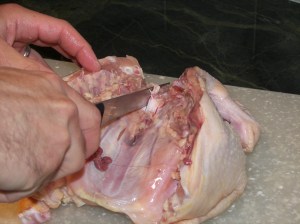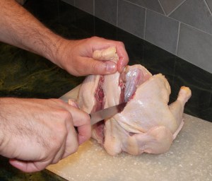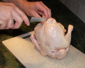 Begin by removing the wish bone (Sorry Kids, I know it’s fun to make a wish, but removing the wishbone before cooking the chicken will make carving easier when the bird is done). Spread the skin by the neck opening apart with your fingers. Locate the wishbone by pressing lightly on the breast meat surrounding the neck opening. The wishbone will feel like an upside down “V” buried just beneath the surface.
