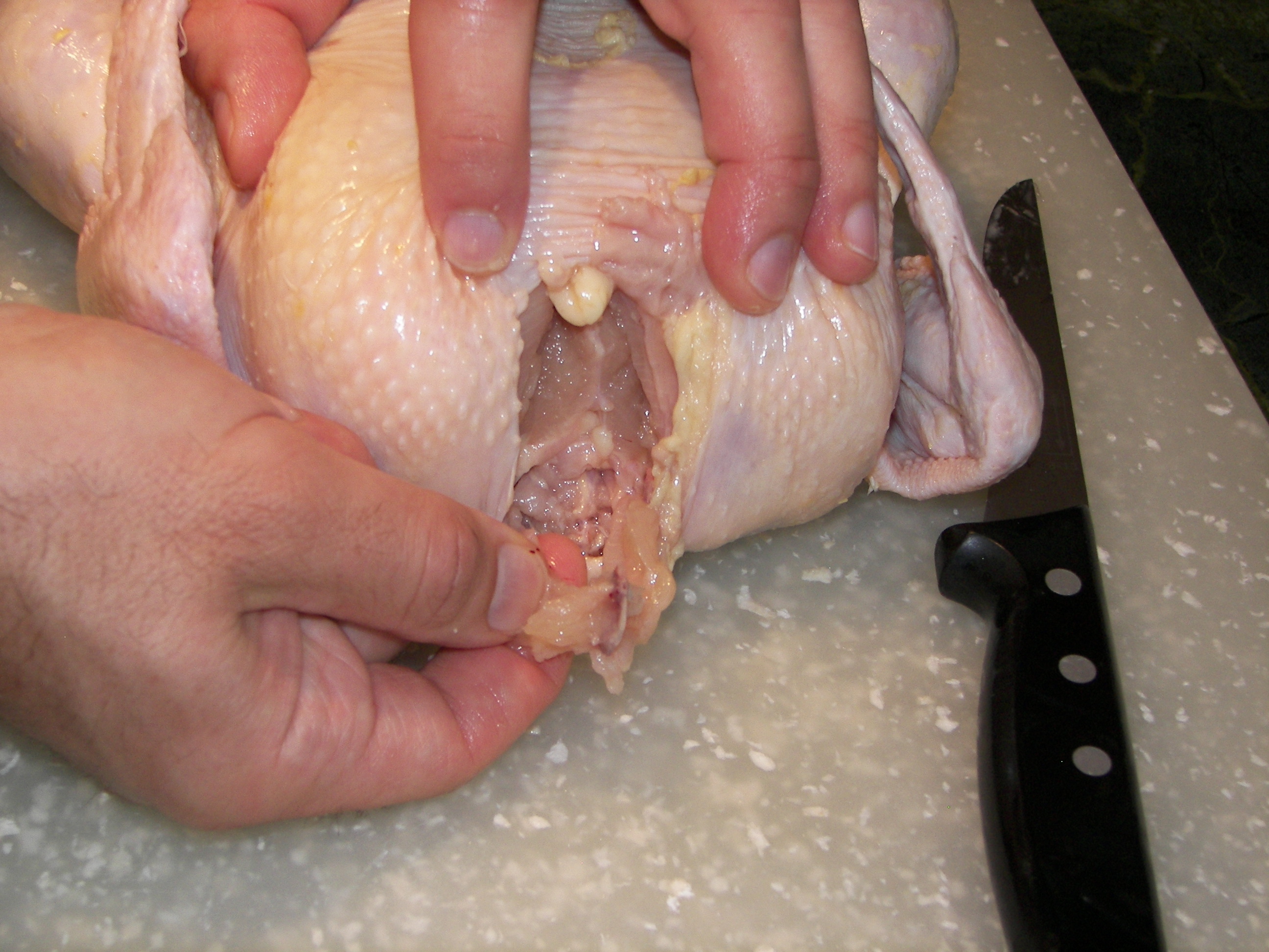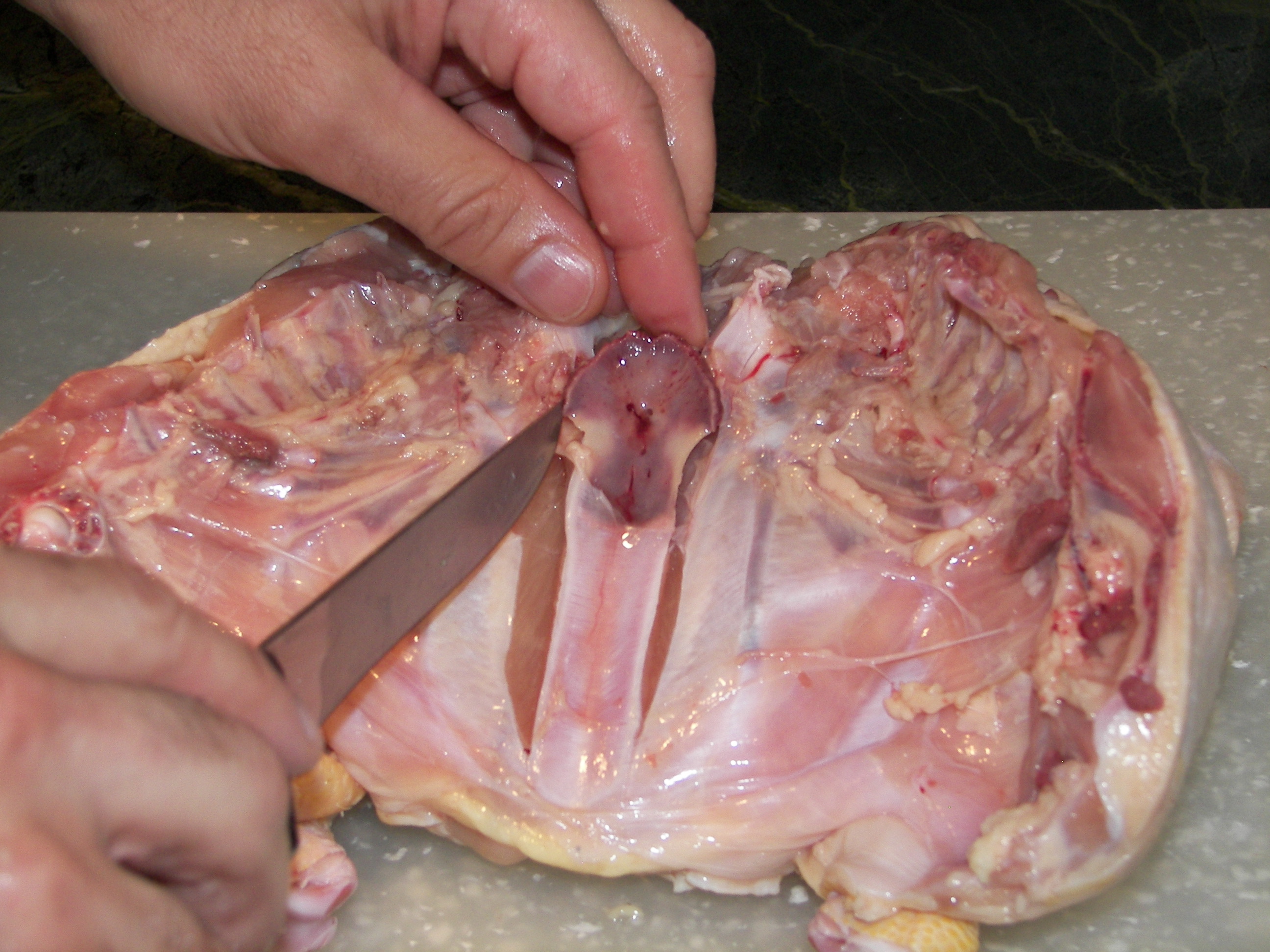 Gently cut the membrane that secures the rest of the sternum to both sides of the chicken. Continue cutting down each side until most of the white, rubber-looking portion is visible.