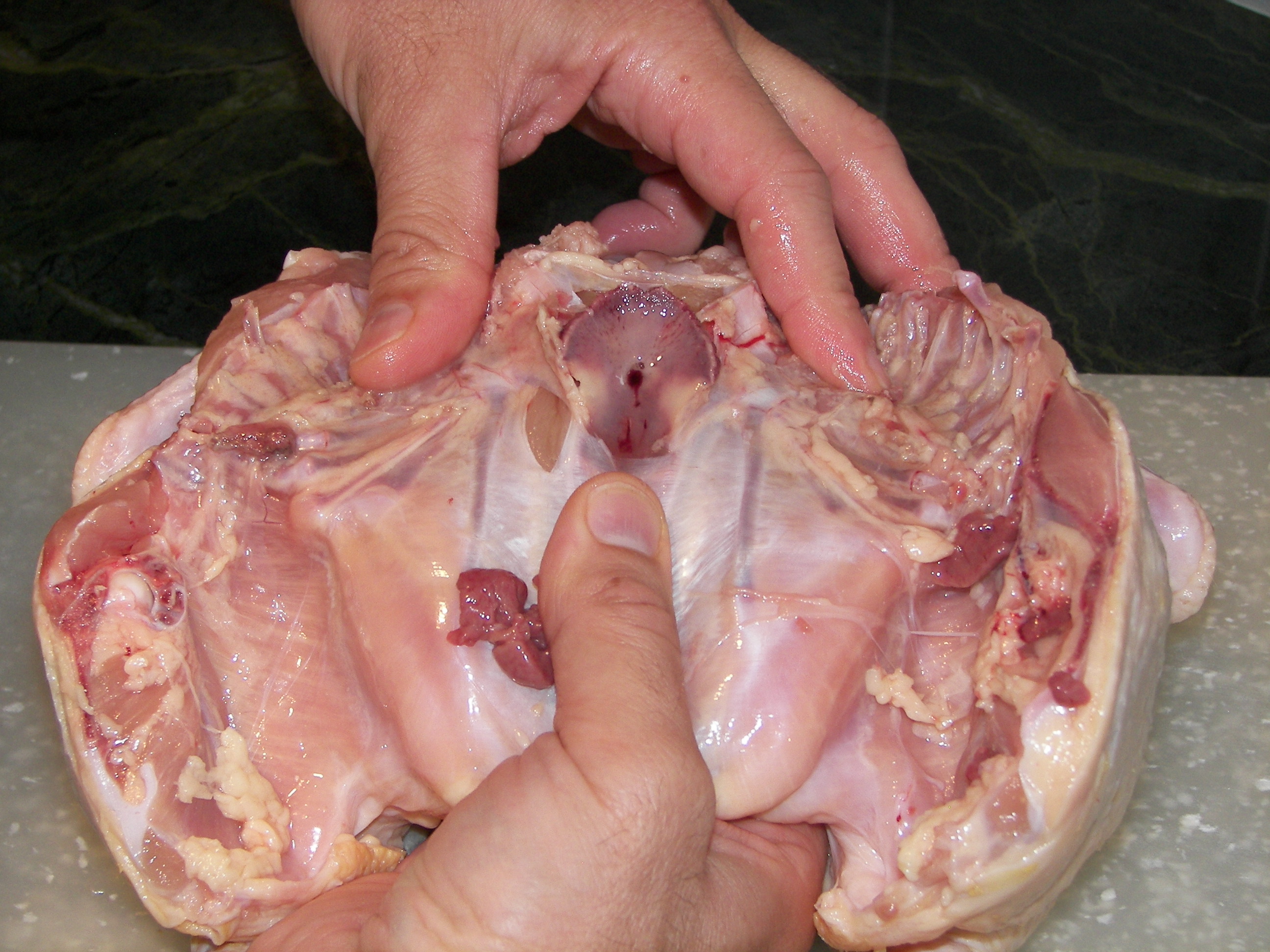 The next step is to remove the Sternum bone. It runs down the middle of the bird and looks similar to a little spoon. The bowl of the spoon will be hard bone material. The handle will appear as if it made from a white rubbery substance.