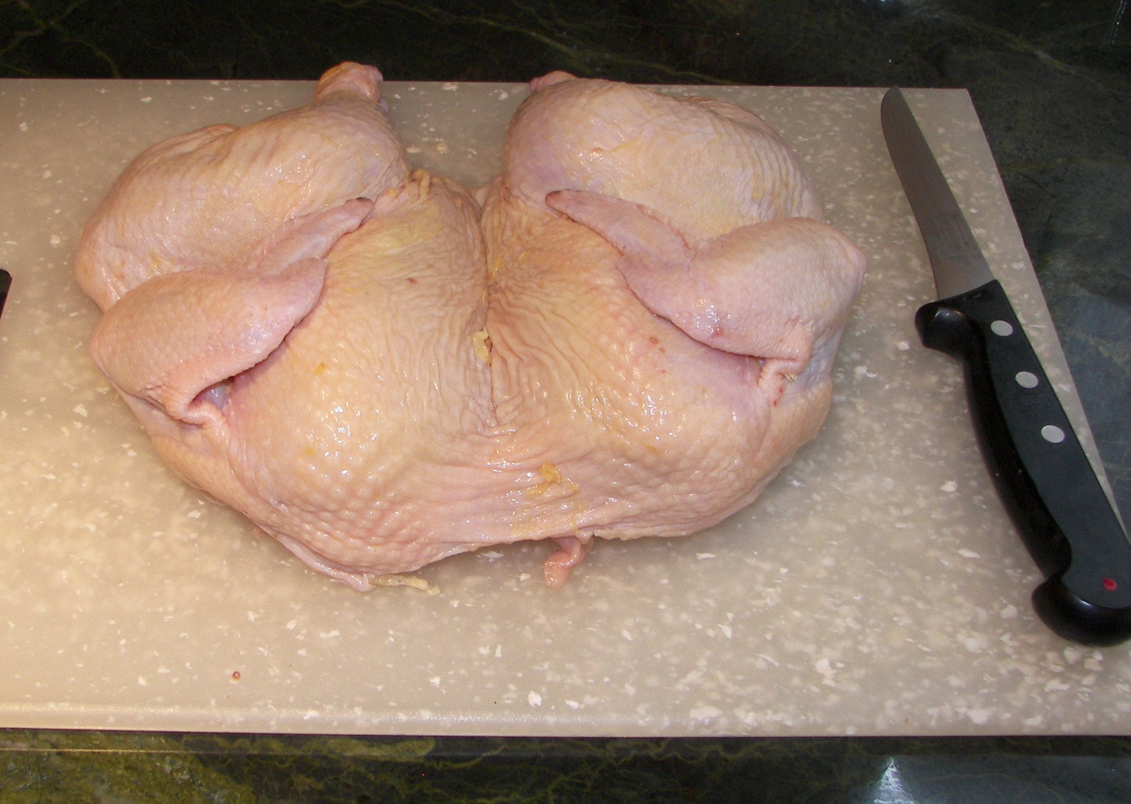 The bird is now fully split open and can be laid flat on the grill or in the pan. As always, any time handling raw poultry make sure to wash your hands and clean all surfaces and utensils thoroughly with soap and hot water before using the food preparation area for anything else.