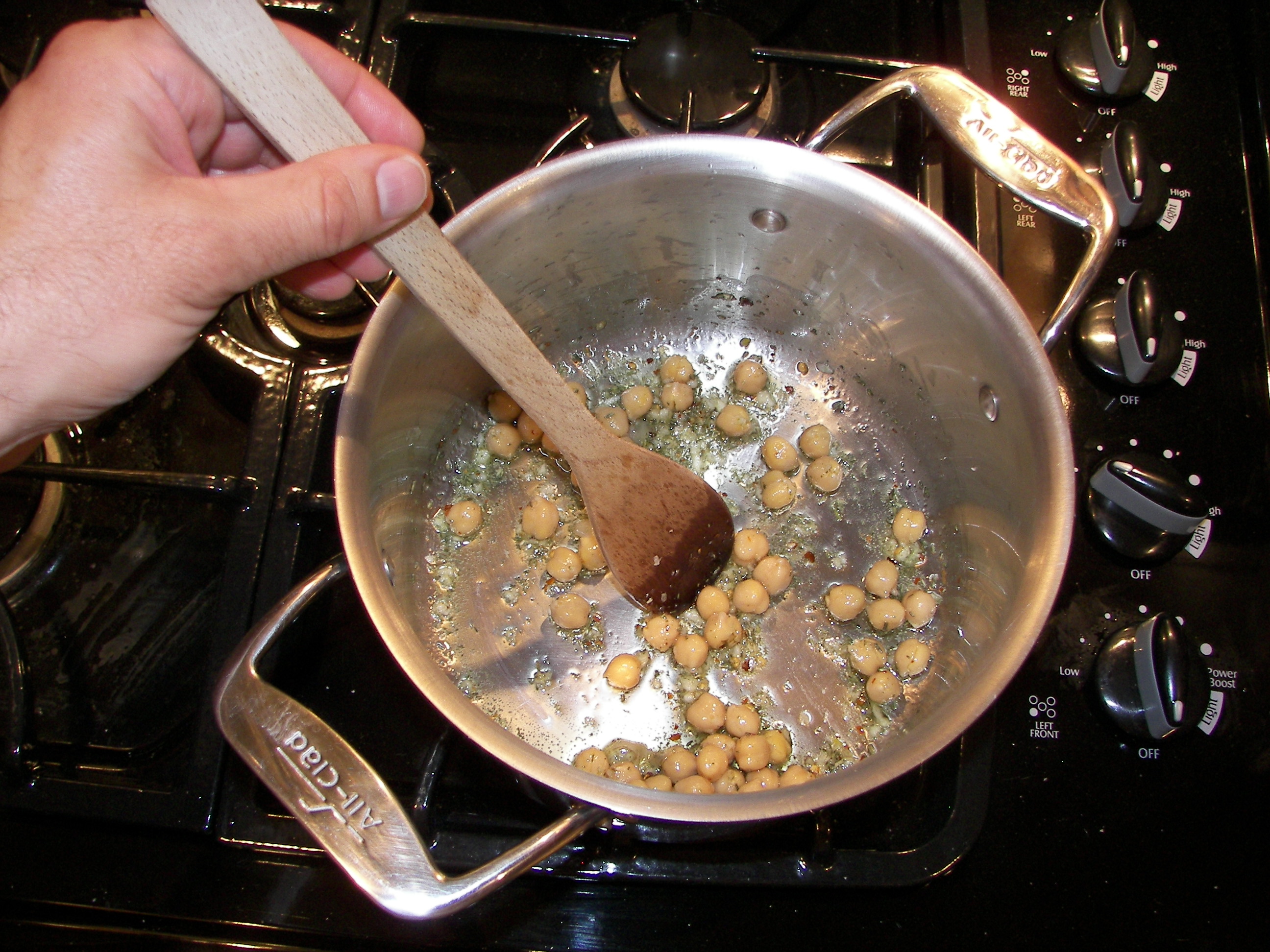 Add ½ cup of Chick Peas. Stir a few more times until they are coated with oil.
