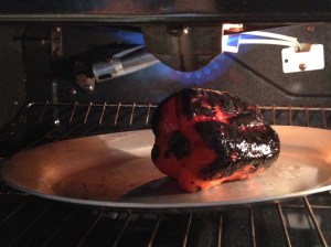 In this method, the pepper is placed on a broiler or sizzle pan and positioned directly under the broiler’s flame. The charring occurs in a contained environment but radiant heat from the pan sometimes over cooks the pepper’s flesh. The result is a thin and mushy final product.