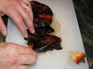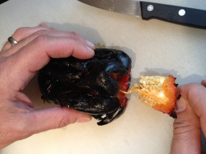Lay the pepper on a flat cutting surface. The inside or “seed” side of the pepper should face down and the charred skin side should face up. Using the blade of a knife, scrape off  the charred skin, being careful not to cut through the pepper.