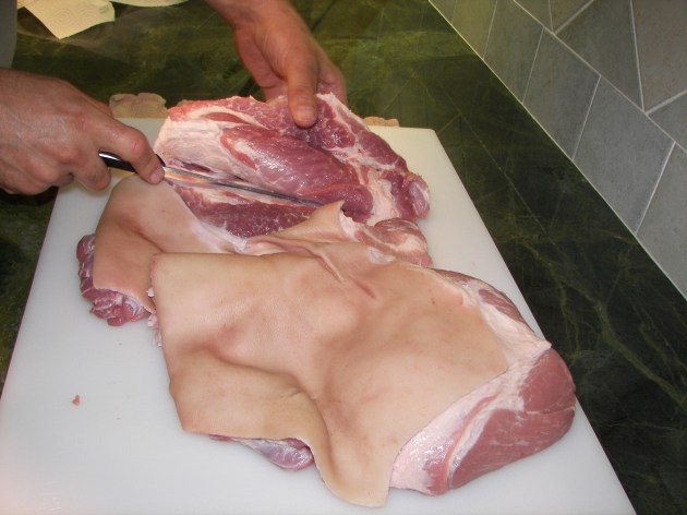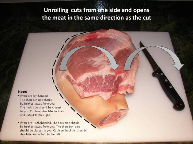 Begin the Unrolling process by positioning the roast on a flat cutting surface. The skin side should be facing down. The first incision should be made on one side of the roast, running from hock to shoulder This will begin to split the picnic shoulder in half. The depth of the cut should extend all the way to the bone.