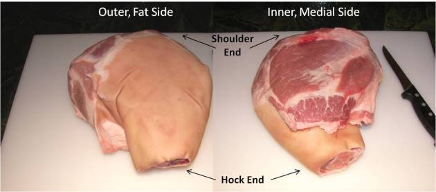 The Picnic Shoulder is now completely boneless.  The incision that was made to remove the bone runs from hock to shoulder. The top portion of meat can now be laid flat.