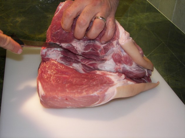 Unlike butterflying, the initial cut to remove the bone occurs on the side of the roast instead of in the middle. The picnic roast is naturally shaped like a cone. The large end of the cone is the shoulder side. The short end is the hock side.