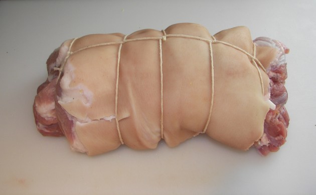 The end result should be a thin slab of meat with the skin located on one side. Trim the roast accordingly to ensure it is even and uniform when rolled back up.