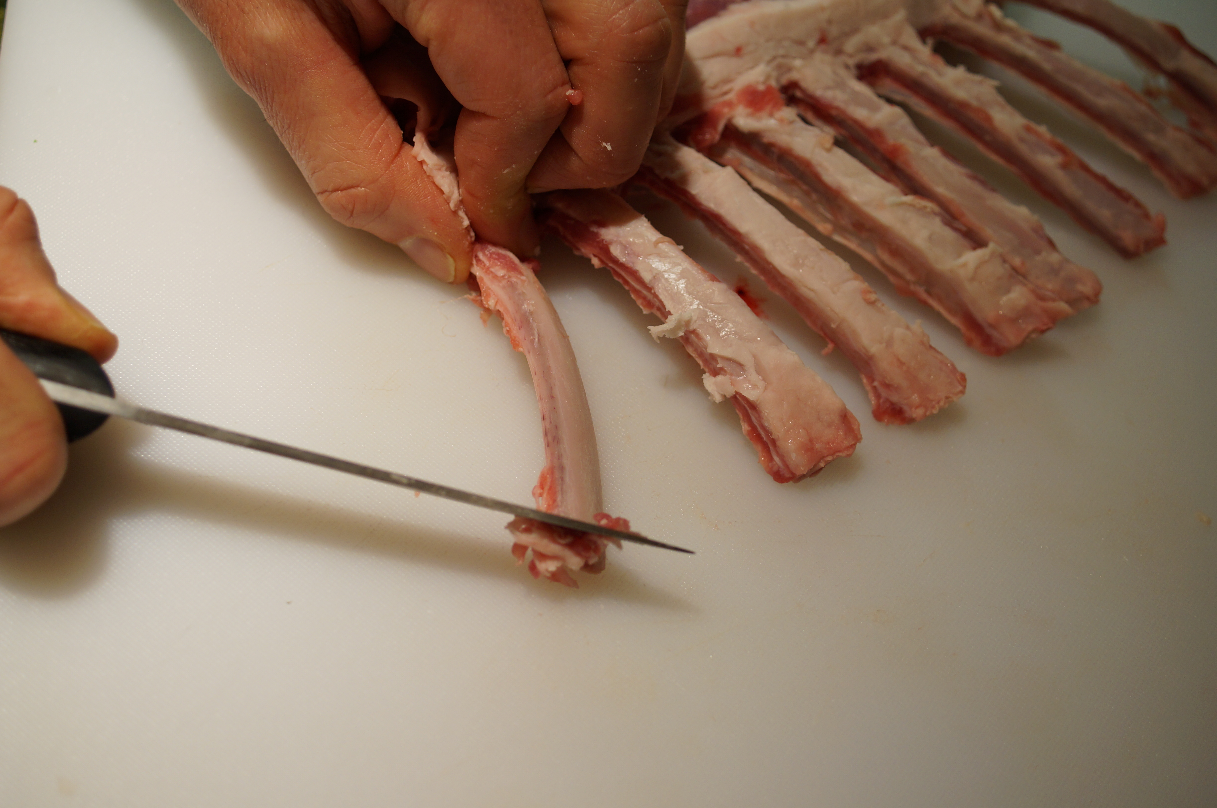 Position the rack so the bones are pointing straight up. Run the knife blade down both sides of each bone. This will free the strips of meat and fatty tissue in between. Be careful not to cut into the eye of meat.