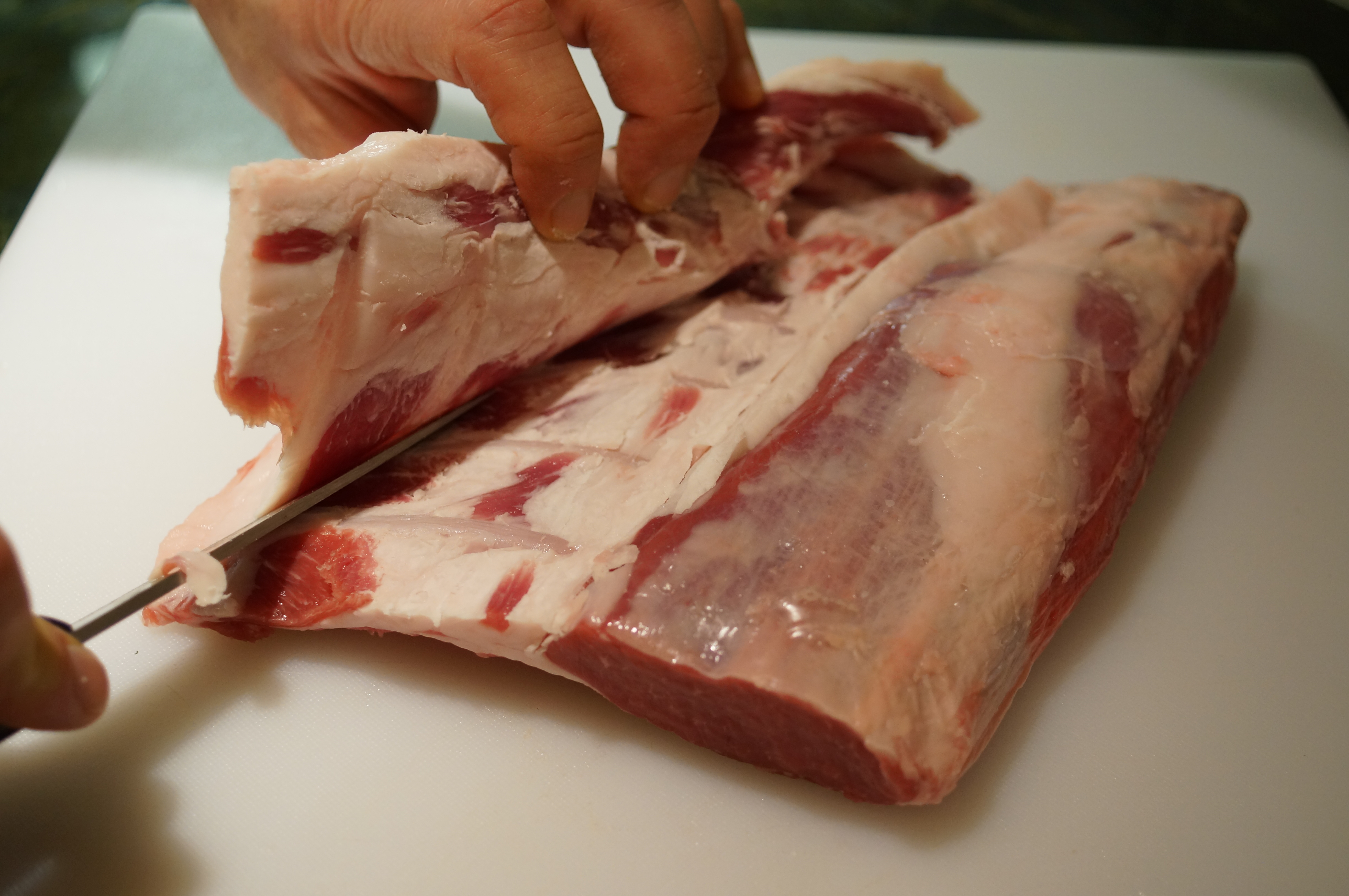 Turn the rack over and make the same cut on the opposite side. This will score the connective membrane on the back. Flip the rack back over and begin peeling the apron of fat back while slicing through the connective tissue as you go. Continue until the fat is completely removed from the rack.