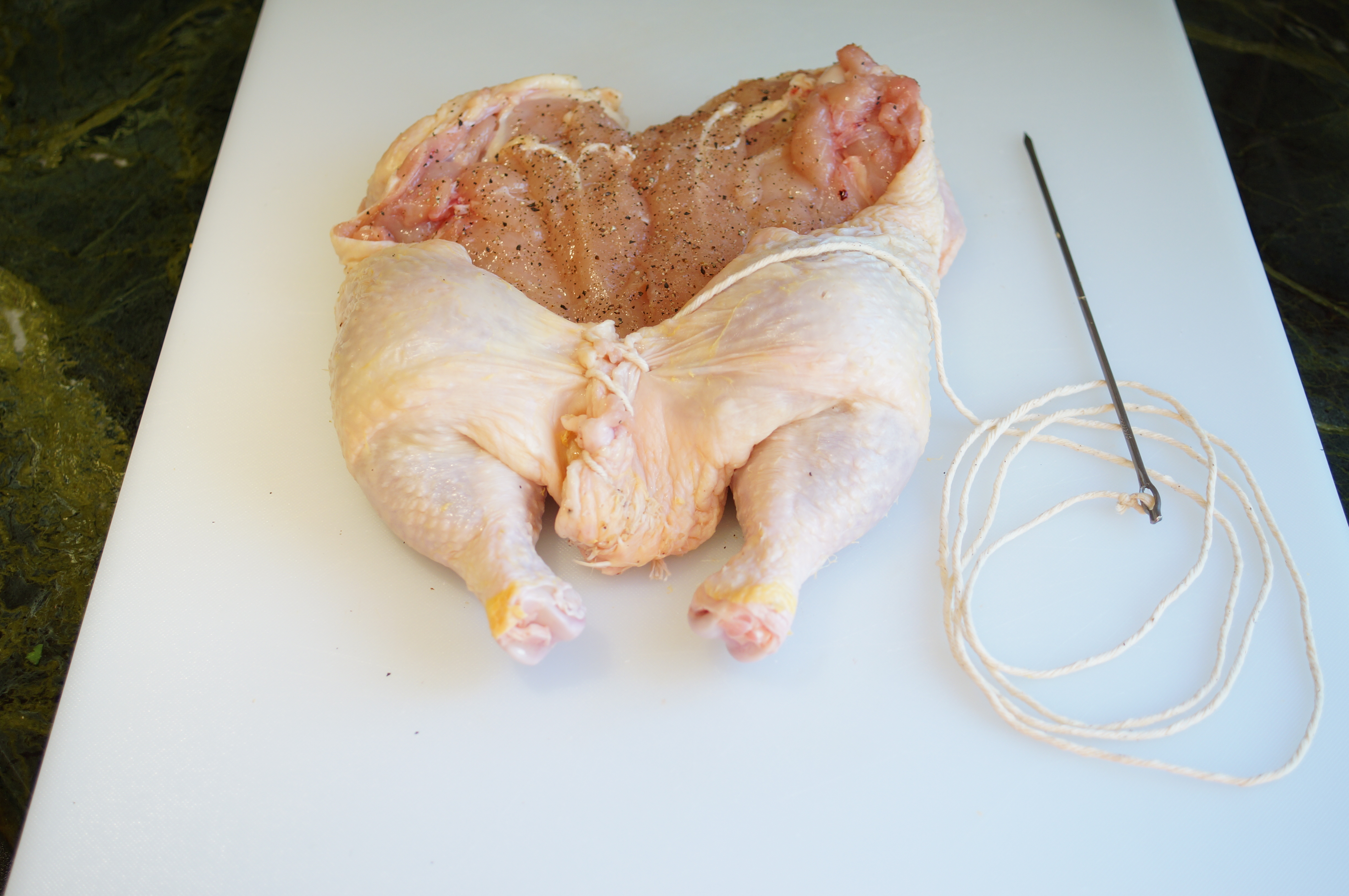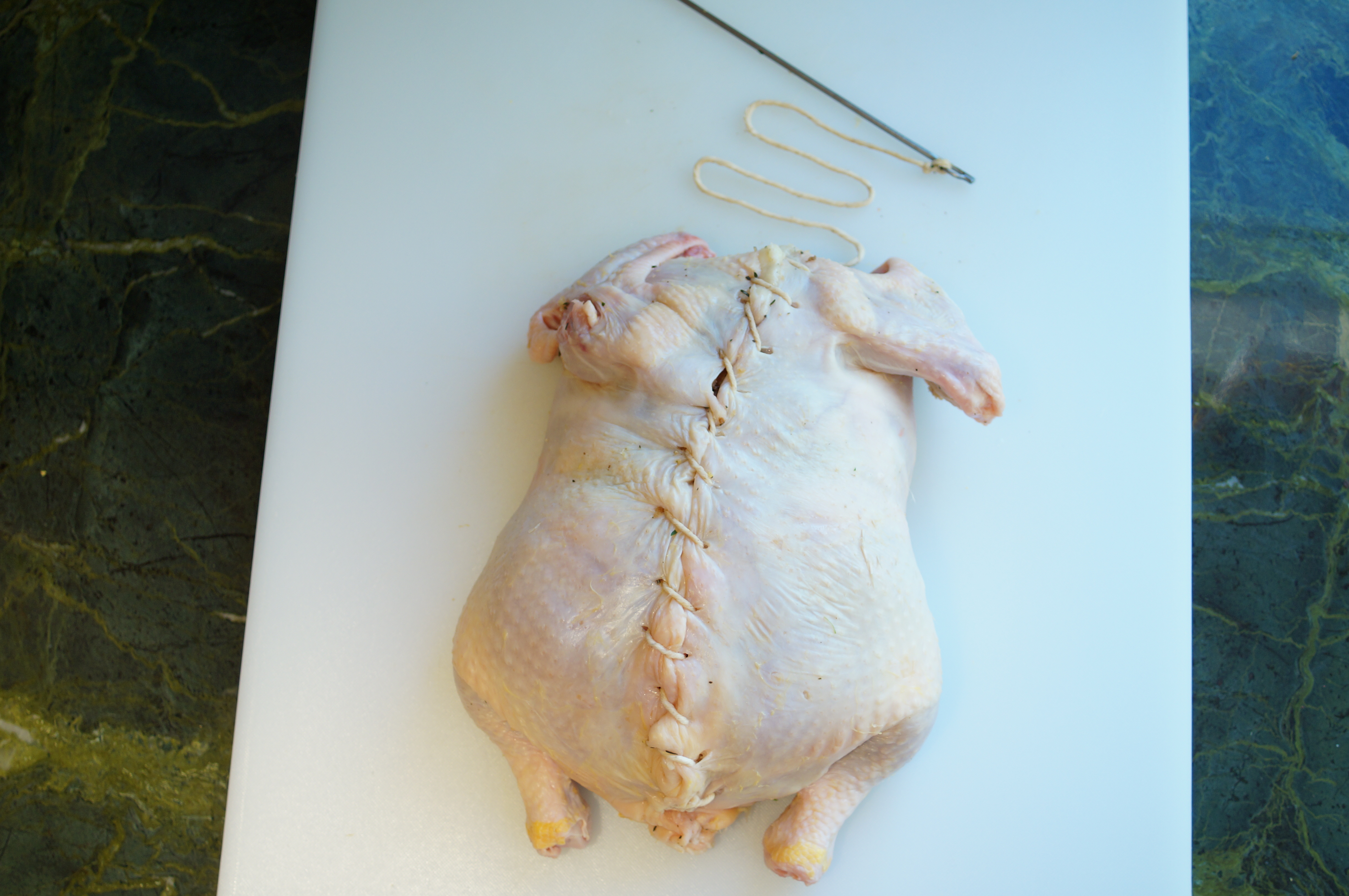 Using a trussing needle and butcher’s twine or several toothpicks, begin to close up the chicken cavity from the tail side working toward the neck. This will create a little pocket.